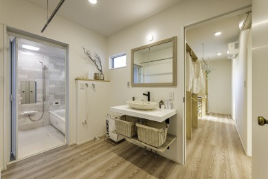 キッチンから洗面、ランドリー、収納までがつながっていて、