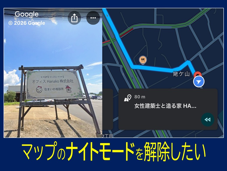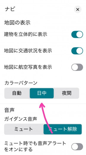 日没と共に暗い地図表示に変わって、見にくくなってしまいます。