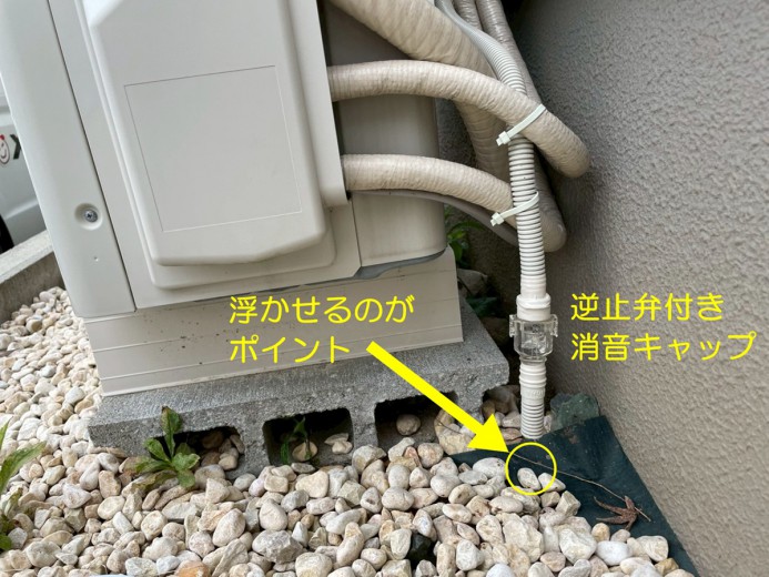 ドレンホースの先端に「消音キャップ」を取付、です。