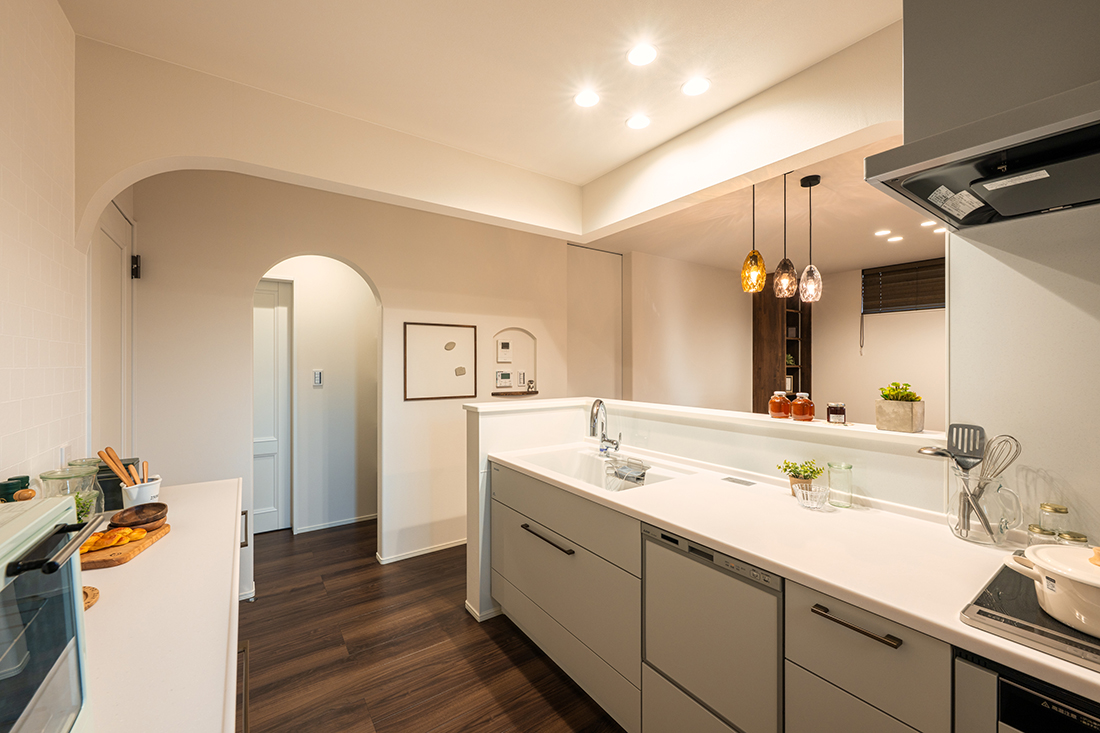 その先に広がるのは、3帖のゆとりある洗面室と、印象的な垂れ壁が目を引くキッチンです。
