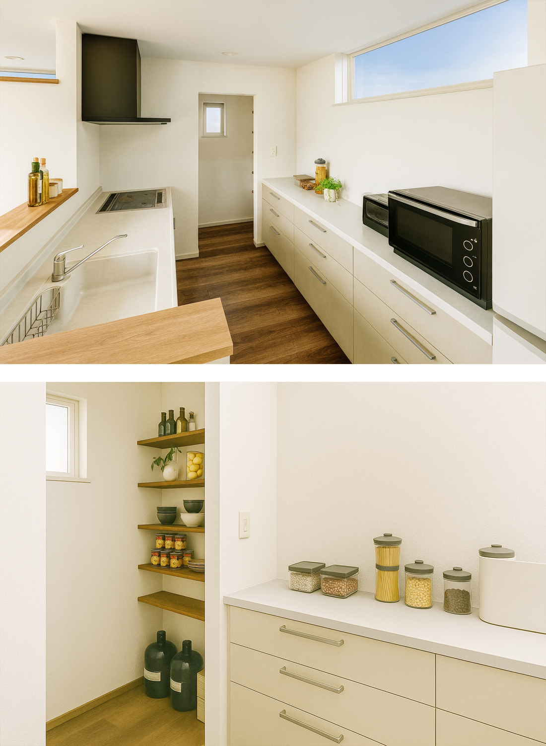 キッチンには、さっと取り出せて、買い物帰りの細かい荷物もすいすい片付くパントリー。