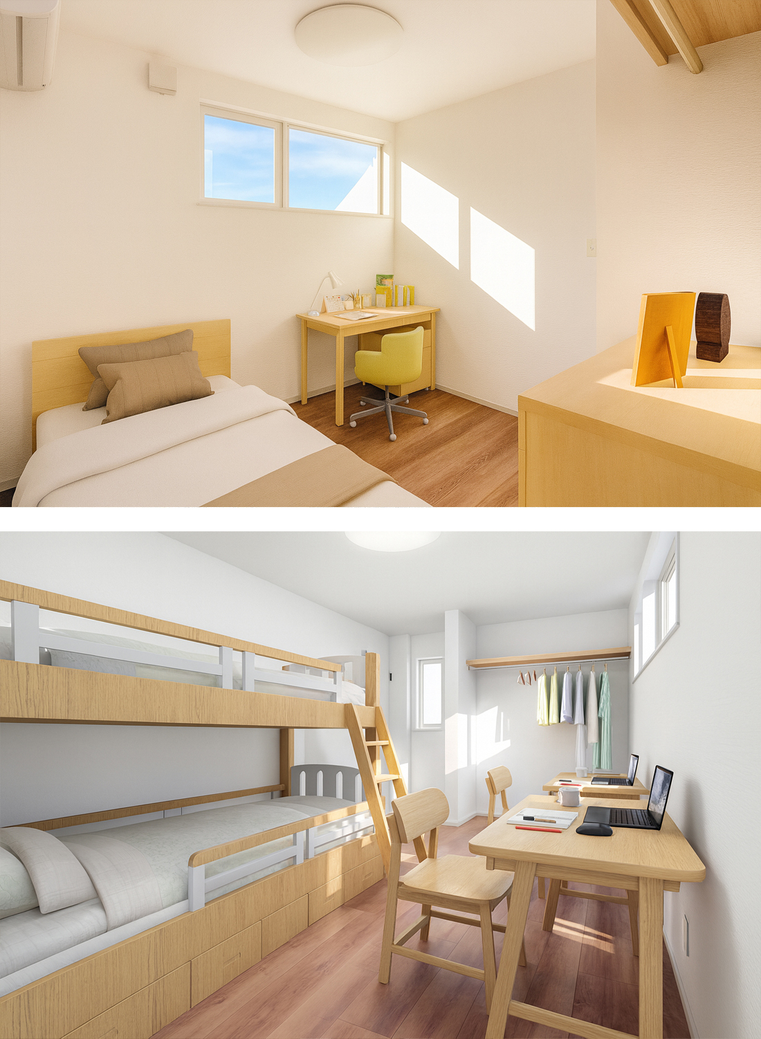 子ども部屋は6.8帖、二段ベッドに勉強机が2台置けるゆとりの広さです。