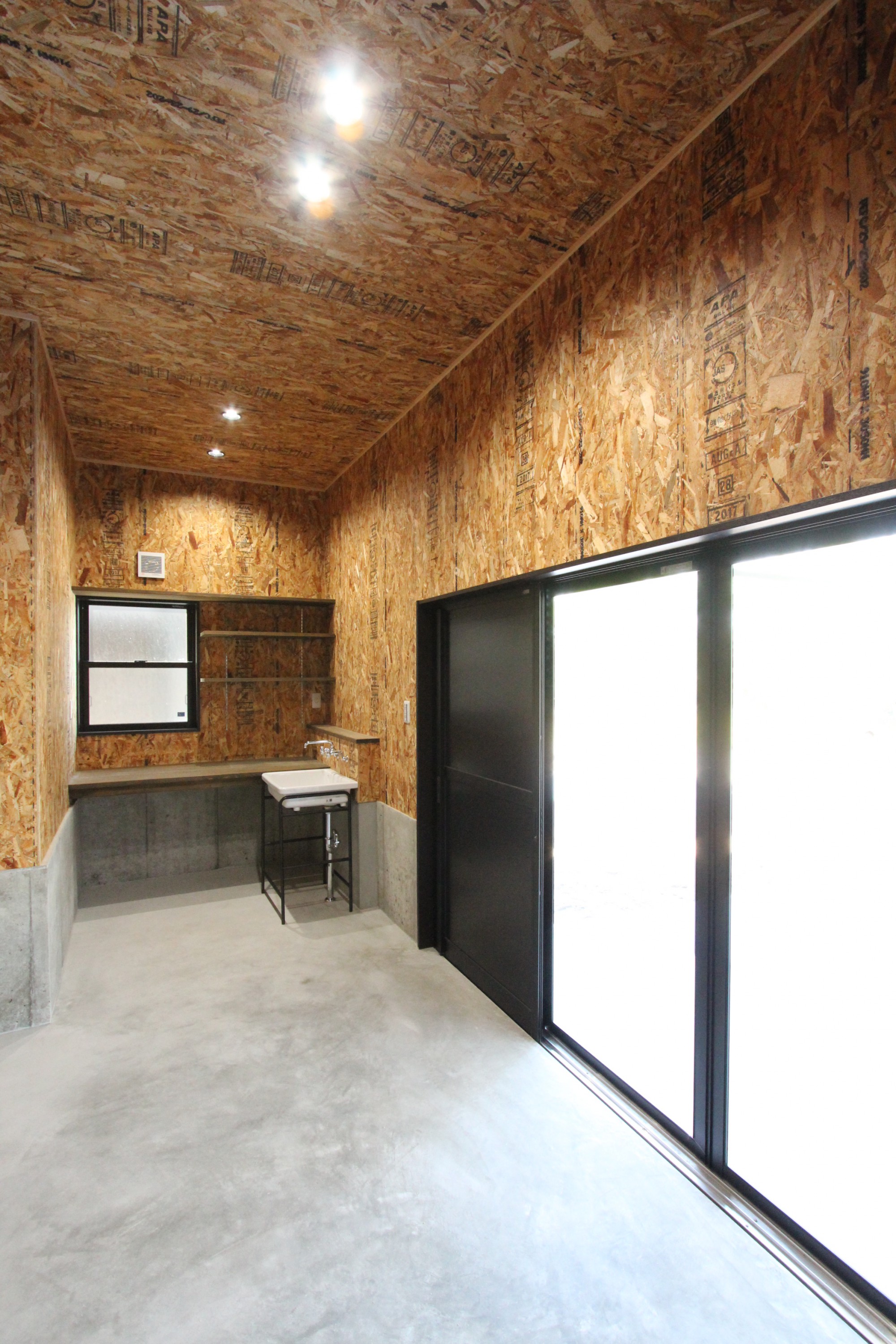 OSBボードと呼ばれる木材の小片を接着剤と混ぜて熱圧成型した板でカッコいいガレージに。